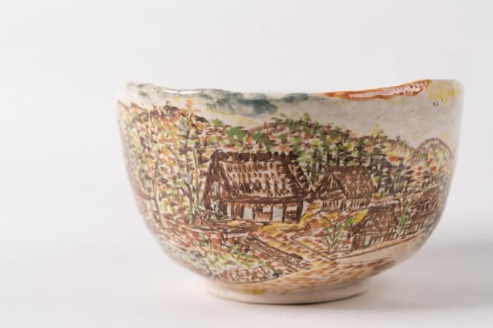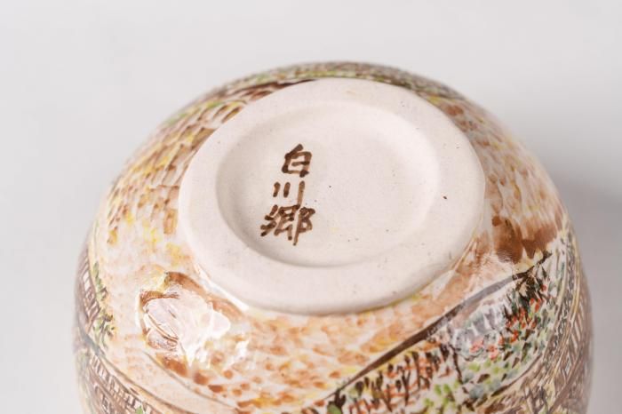 岐阜県高山市久々野町に工房を構える【山梨窯】が、一つひとつ丹念に仕上げた陶器です。飛騨の山々に抱かれた豊かな自然の中で採れる陶土を原料として、独自に調合した釉薬を用いて焼き上げています。外側には世界遺産にも登録されている【白川郷の合掌造りの風景】を、内側には四季折々の花を絵付し、飛騨の自然と暮らしの美しさを器いっぱいに表現しました。すべて職人の手描きによるため、同じ図柄でも一つとして同じものはなく、それぞれに異なる味わいが感じられます。