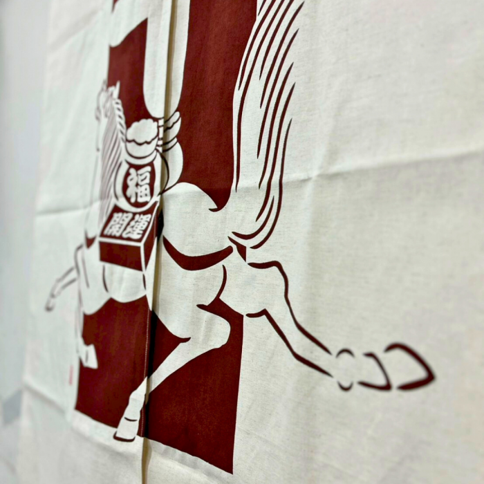 令和8年(2026年)の干支、午(うま)を生地に型染したのれんになります。新しい年に幸運を運んできてくれます。