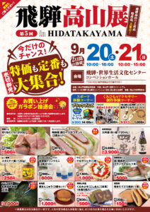 2025.09.10 ✨第5回 飛騨高山展inHIDATAKAYAMA✨ 飛騨高山の特産品・土産品が一堂に集結! 肉厚ハムやフランクフルトなどの絶品グルメ みんな大好き「高山ラーメン」! 和洋スイーツや飛騨のお漬物 地酒やヨーグルトなどの逸品 工芸品や体験コーナー 数量限定のお得な商品はもちろん、 定番の人気商品もたくさん揃っています さらに 会場限定【豪華賞品が当たる抽選会】も開催 家族みんなで楽しめる2日間です 飛騨・世界生活文化センター コンベンションホール 〒506-0032 岐阜県高山市千島町900-1 ・9/20(土) 10:00~16:00 ・9/21(日) 10:00~15:00 今だけの特別価格 数量限定・売り切れ御免 オンラインショップからも購入可能 ※掲載商品は目玉商品の一例です。 飛騨高山の魅力を体感しに、ぜひお越しください! 第5回飛騨高山展inHIDATAKAYAMAチラシ #飛騨高山 #第5回飛騨高山展 #特産品 #土産品 #イベント情報 #グルメイベント #工芸品 #飛騨豚 #地酒 #限定価格 #抽選会 #高山観光 #hidatakayama #岐阜イベント #gifu #体験 #オンラインショップ #高山ラーメン #地酒 #スイーツ #工芸品